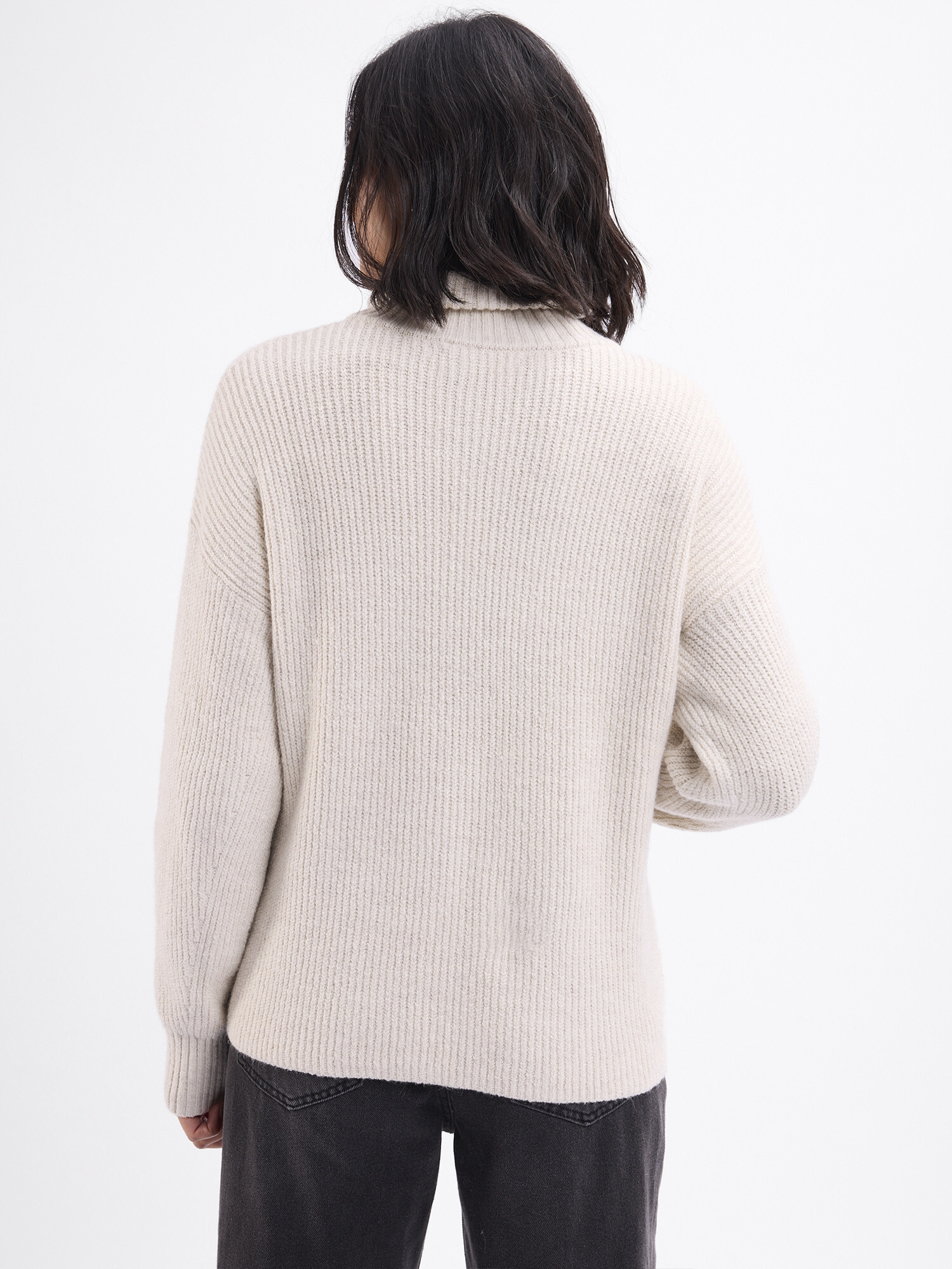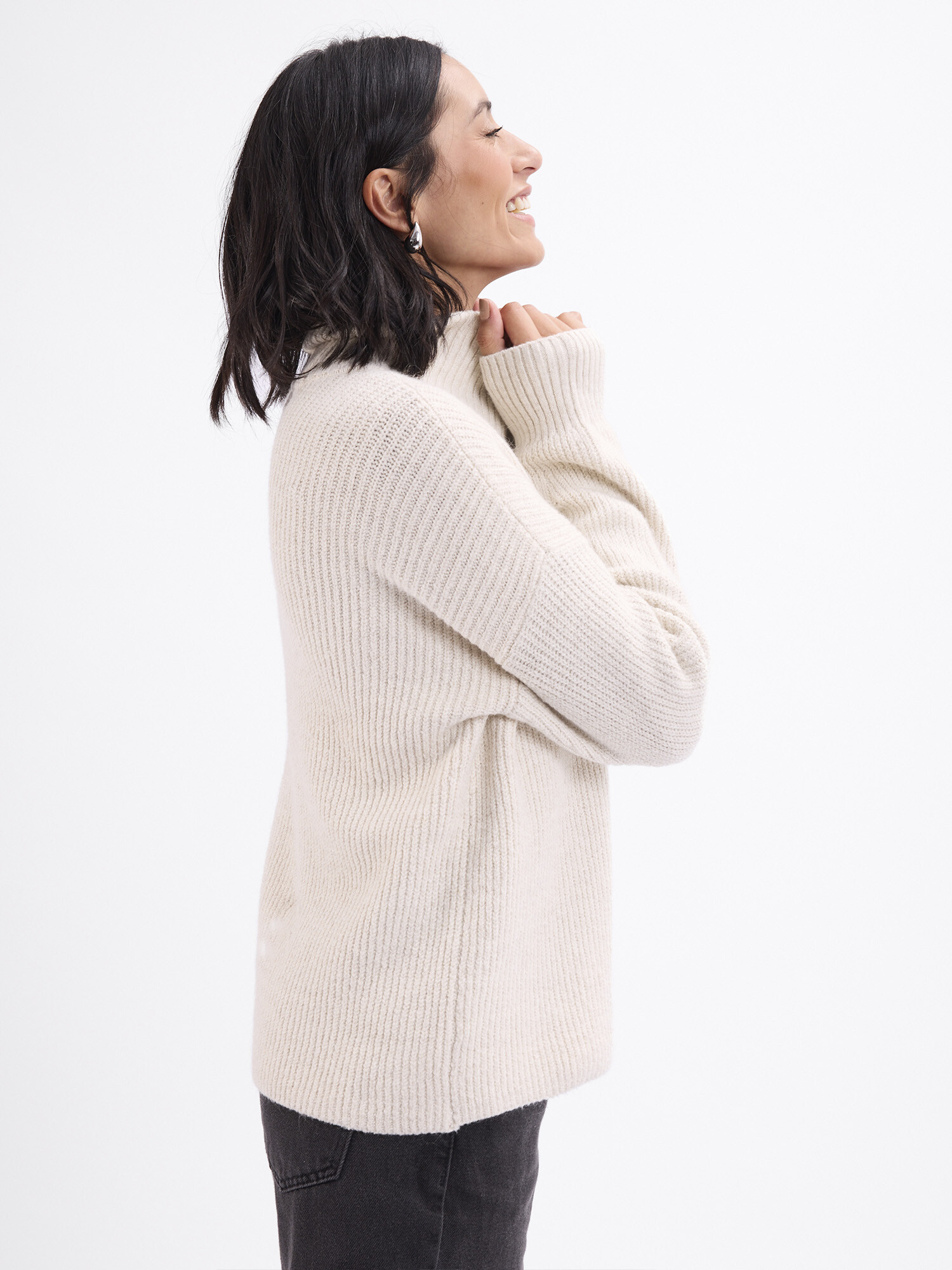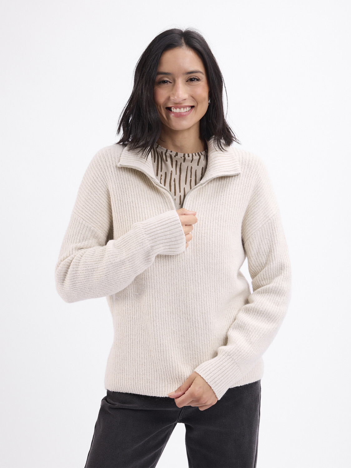 Sweater tejido con cuello alto y medio cierre.
